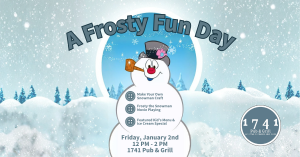 Bundle up for A Frosty Fun Day at 1741 Pub & Grill! Join us on January 2nd from 12 PM - 2 PM for a wintery afternoon designed especially for families and kids.