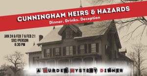 Step inside the storied halls of the historic Lyman Homestead and help unravel Cunningham Heirs & Hazards, a thrilling, interactive "whodunit" where every guest plays a role in cracking the case. Join us for an evening of dining, detective work, and deliciously dramatic twists.